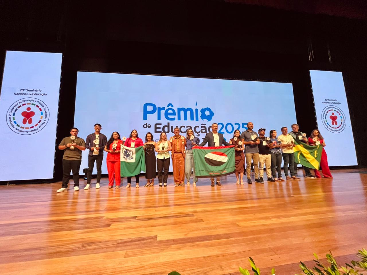 Durante o seminário, a professora Maria Eduarda Bezerra Lacerda, da Escola Maurino Rodrigues de Andrade – CENEC, ganhou destaque ao ficar entre os 10 professores selecionados para a premiação Educador Nota 10. A docente recebeu o troféu com o projeto “Audácia de jogar futebol de mulheres na cidade dos homens: aulas-treino pela pedagogia da corporeidade”, sendo reconhecida pela relevância e inovação de sua proposta educacional.
